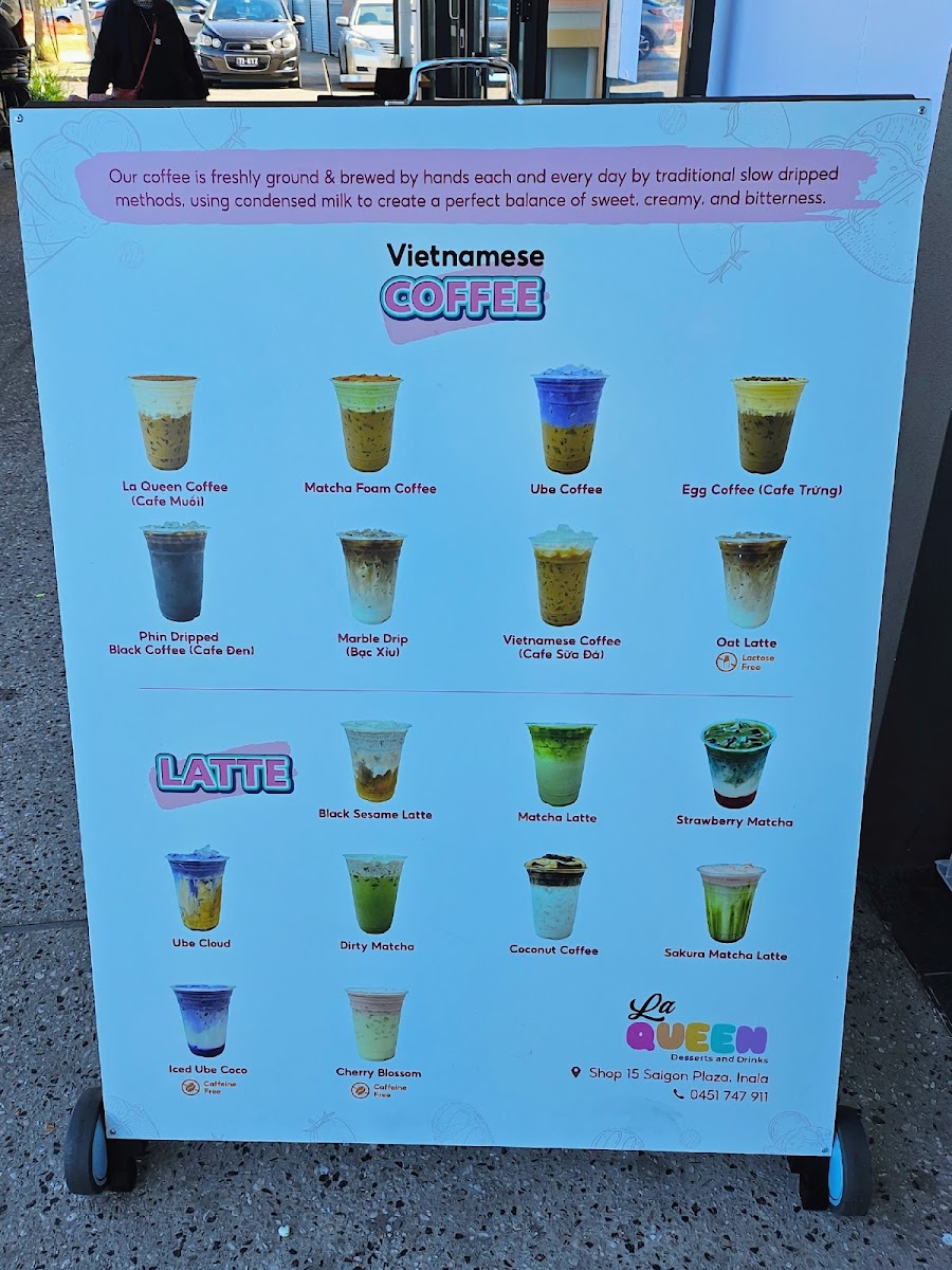 Welcome to LA QUEEN DESSERTS AND DRINKS, a charming café nestled on the ground floor of Saigon Plaza in Inala, QLD. This delightful spot features an enticing menu filled with specialty beverages and desserts that pique your senses.